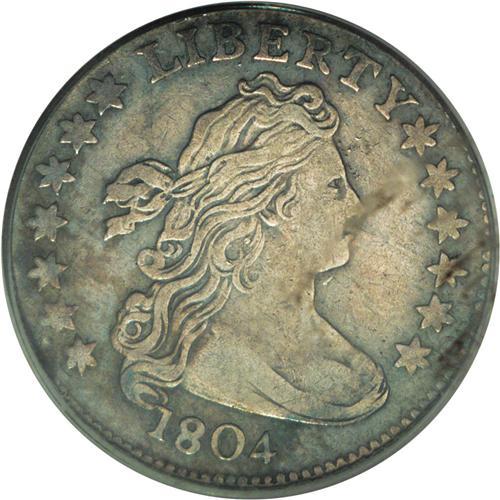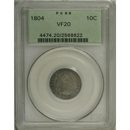 <B>1804 10C 13 Stars on Reverse VF20 PCGS.</B></I> JR-1, R.5. Dusky milky-gray and sky-blue toning embraces this richly detailed rare date dime. Only 8,265 pieces were struck, and these are roughly divided into two separate <I>Guide Book</B></I> varieties. Much scarcer than the 1805. Housed in a green label holder. Population: 1 in 20, 9 finer (11/06).<BR><BR><b>Shipping:</b> Coin/Currency (<a target="_blank" href="http://www.heritageauctions.com/common/shipping.php">view shipping information</a>)