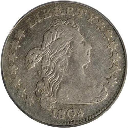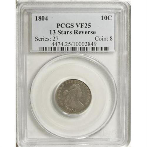 <B>1804 10C 13 Stars on Reverse VF25 PCGS.</B></I> JR-1, R.5. Except for the half cent, 1804 is a rare date across all denominations. Although the 1804 cent gets more publicity, the dime is certainly rarer, even though two die marriages are known. These are often separately collected, as they receive separate Guide Book listings due to a different number of stars on the reverse.<BR>The present 13 reverse stars example has medium apricot and steel-gray toning. Careful scrutiny fails to locate remotely mentionable marks. The shield lines are fully separated, and the wings retain substantial plumage. Population: 2 in 25, 8 finer (8/07).<I><BR>From The Beau Clerc Collection.</B></I><BR><BR><B>Coin Engraver:</B> Robert Scot<BR><BR><b>Shipping:</b> Coins & Currency (<a target="_blank" href="http://www.heritageauctions.com/common/shipping.php">view shipping information</a>)