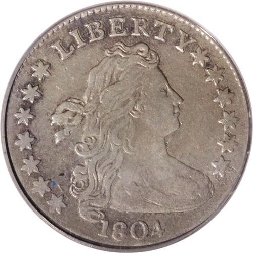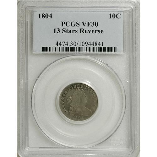 <B>1804 10C 13 Stars on Reverse VF30 PCGS.</B></I> JR-1, R.5. Considered the key date from among early dimes, the 1804 is known in two varieties, one with thirteen stars on the reverse and one with fourteen, each of which has its own <I>Guide Book</B></I> listing. This coin shows the light to moderate wear expected of the grade, with the vast majority of detail remaining very clear except for a softly struck area near 1 o'clock on the reverse, as is normal for the variety. A few marks are noted on the slate-gray surfaces, yet they are completely consistent with a coin that spent a short time in circulation. An excellent circulated example for the specialist.<BR><BR><b>Shipping:</b> Coins & Currency (<a target="_blank" href="http://www.heritageauctions.com/common/shipping.php">view shipping information</a>)