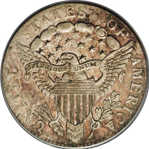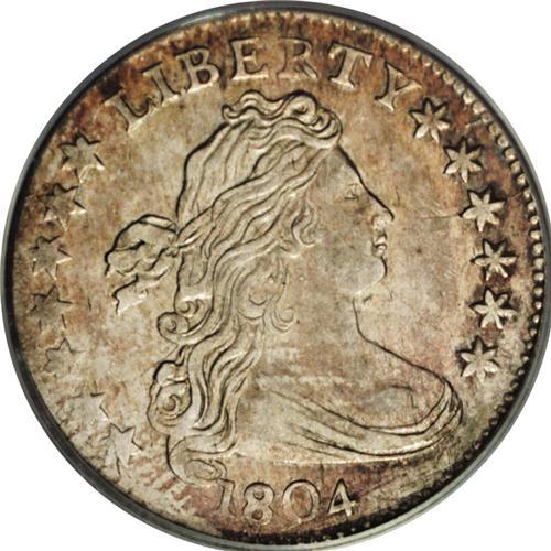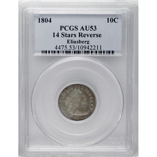<B>1804 10C 14 Stars on Reverse AU53 PCGS.</B></I> Ex: Eliasberg. JR-2, R.5. This is the first auction appearance of this example in several decades as it did not appear in any of the previous Eliasberg sales. Two varieties are known for the 1804 dimes, identified by either 13 stars or 14 stars on the reverse. This 14 Stars variety is considerably scarcer, and the present example is almost certainly the finest known of these pieces, arguably the finest known of the date. Only one piece has received a higher certified grade, an AU55 example of the 13 Stars reverse certified by NGC.<BR> While the recorded mintage for the date was just 8,265 pieces, most numismatists today believe that a small number of the dimes struck in 1805 were also dated 1804. There are probably about 60 to 70 surviving examples of the 13 Stars variety and 40 to 50 surviving examples of this 14 Stars variety, including pieces that have been certified and others that have not been graded.<BR> This piece is a lovely example with exquisite central obverse and reverse details. The left side of the obverse and reverse exhibit some weakness, a characteristic of the variety and similar on every known piece. Pale golden-brown toning is visible across much of the obverse and reverse with some areas of lighter silver color. Light wear is evident only on Liberty's shoulder, a few of the hair strands, and the clouds over the eagle. While faint hairlines are typical for these coins, few can boast the quality of surfaces seen here. This is an amazing example of the date and variety, easily a coin that will gain the attention of variety collectors and specialists.<BR> NGC and PCGS have combined to grade 23 examples of the 13 Stars variety with an average grade of just 29, while these two services have graded just nine examples of the 14 stars variety with an average grade of 31. While considering this data, it is important to remember that average certified grades tend to be higher than the overall average grade. Population: 1 in 53, 0 finer (11/06).<BR><I>From The Collection of Louis E. Eliasberg, Sr.</B></I><BR><BR><b>Shipping:</b> Coin/Currency (<a target="_blank" href="http://www.heritageauctions.com/common/shipping.php">view shipping information</a>)