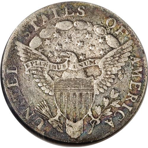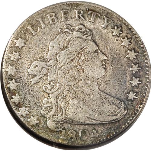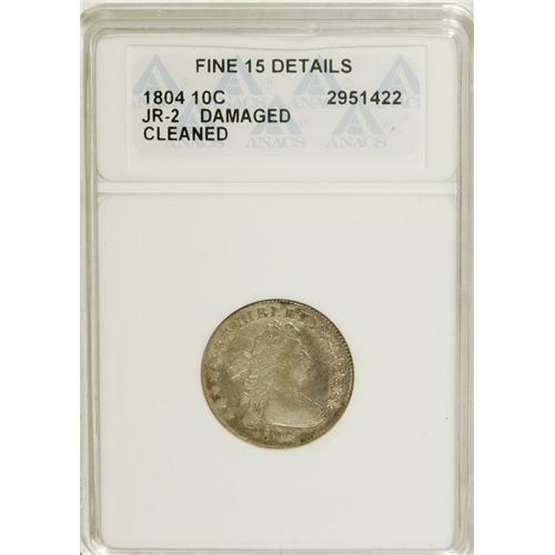 <B>1804 10C 14 Stars on Reverse--Damaged, Cleaned--ANACS. Fine 15 Details.</B></I> JR-2, R.5. The 1 in the date touches the curl, and star 7 is distant from the L. The reverse shows, of course, 14 stars, with the last star touching both the neck and the motto. Much pleasing detail remains on this coin, and the surfaces are not overbright despite the mentioned cleaning, with a dove-gray obverse and some russet and aqua reverse toning. Under a loupe, the surfaces show moderate pitting from apparent corrosion, although ANACS has specified it as merely "damage." This variety, as Lovejoy <I>et al.</B></I> claim in the standard reference, is unknown in Mint State, although we offered an AU53 piece, the Eliasberg coin, in a recent sale. This is another variety from this consignment in which series specialists will show keen interest.<BR><I>Ex: Stack's 71st Anniversary Sale (10/2006), lot 2649.</B></I><BR><BR><b>Shipping:</b> Coins & Currency (<a target="_blank" href="http://www.heritageauctions.com/common/shipping.php">view shipping information</a>)