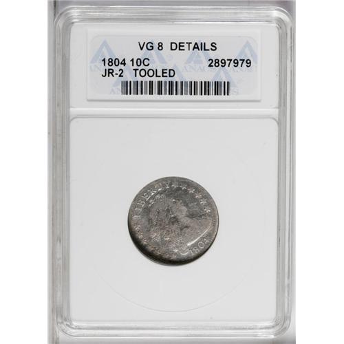 <B>1804<10C> 14 Stars on Reverse--Tooled--ANACS. VG8 Details.</B></I> JR-2, R.5. Each die pairing for this issue is a rarity. A heavily worn piece with distinct tooling marks on each side and strangely glossy blue-gray and olive surfaces.<BR><I>From The Catfish Creek Collection, Part Two.</B></I>