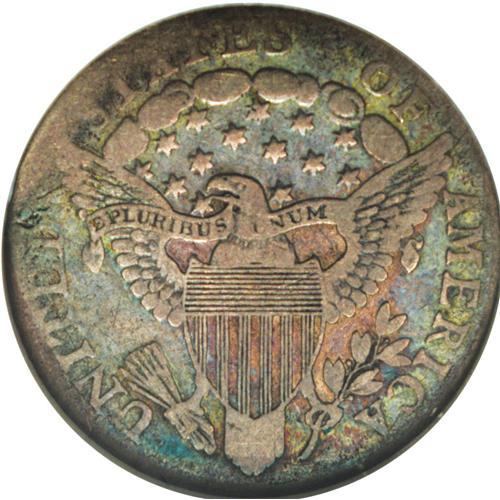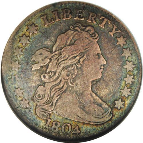 <B>1804 10C 14 Stars on Reverse VF20 NGC.</B></I> JR-2, R.5. The popular blundered die variety with 14 stars above the eagle, instead of the proper 13 stars. This pleasing example has powder-blue, peach, lilac, and apple-green toning. Thin marks beneath the chin and above the hair ribbon are of little import. Nearly all of E PLURIBUS UNUM is legible, and only the left borders exhibit uneven wear.<BR><BR><b>Shipping:</b> Coin/Currency (<a target="_blank" href="http://www.heritageauctions.com/common/shipping.php">view shipping information</a>)