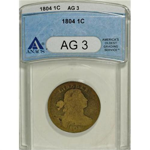 <B>1804 1C AG3 ANACS.</B></I> S-266, B-1, R.2. The central devices are outlined, and contain just a modicum of internal detail, and the date shows, albeit weakly. ONE CENT is relatively strong. The light to medium brown surfaces show just honest wear. All in all, quite pleasing for the grade. EAC 3.<BR><BR><B>Coin Engraver:</B> Robert Scot<BR><BR><b>Shipping:</b> Coins & Currency (<a target="_blank" href="http://www.heritageauctions.com/common/shipping.php">view shipping information</a>)