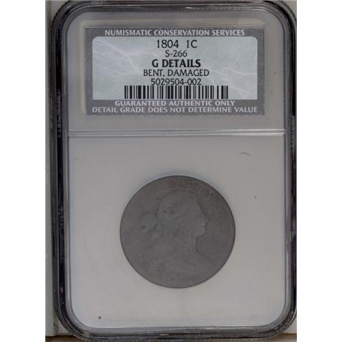 <B>1804<1C>--Bent, Damaged--NCS. Good 4 Details.</B></I> S-266, B-1, R.2. Heavily worn and slightly bent with some pockmarks on the obverse. In this case, of course, the Sheldon rarity does not adequately describe the imbalance of supply and demand, and this is an affordable opportunity to own an example. EAC 2.