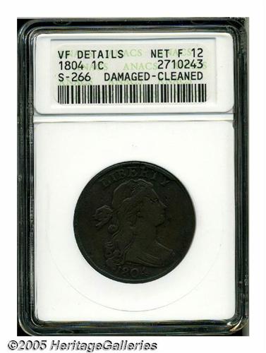 <B>1804<1C>--Damaged, Cleaned--ANACS. VF Details, Net Fine 12.</B></I> S-266, R.2. The late die state with prominent cuds above RTY and MERIC. The obverse is unnaturally light, the darker reverse is somewhat glossy, the portrait has faint pinscratches, and the borders appear to be flattened at 4 and 10 o'clock.