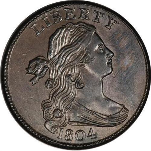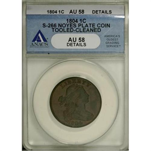 <B>1804 1C Early Die State. AU58 Details, Tooled, Cleaned, ANACS. S-266a, B-1, R.2.</B></I> <B>Bland XF40; tied for CC-8. Noyes XF40; tied for CC-6. Photo #20911. Our EAC Grade XF40.<BR><BR>Equivalents. </B></I>Proskey 1; Doughty 198; McGirk 1A; Clapp 1; EAC 1; <I>Encyclopedia </B></I>1760; PCGS #1504.<BR><B><BR>Variety. </B></I>Triple punched 4. High leaf below left corner of S. The obverse appears on S-266. The reverse appears on S-266.<BR><B><BR>Surfaces. </B></I>Uncertified due to obverse tooling. The right obverse field has been tooled or repaired, and recolored. The remainder of the obverse and reverse surfaces are nearly flawless, with glossy light brown color and only a trace of wear.<BR><BR>Del Bland notes that this piece was repaired prior to 1912. The name Wm. W. Baldwin was scratched in the right obverse field.<BR><B><BR>Die State II. </B></I>(S-266a) with faint die cracks through ERT and MERIC, but prior to the appearance of rim breaks on either side. Scarcer than 266c; commoner than 266b.<BR><B><BR>Appearances. </B></I>The obverse and reverse are illustrated in <I>Early American Cents</B></I>, <I>Penny Whimsy</B></I>, and Noyes.<BR><B><BR>Census. </B></I>Despite the tooling and other imperfections, this example still nearly reaches the Condition Census for the variety, based on sharp details and otherwise excellent surfaces.<BR><B><BR>Provenance. </B></I><I>Lyman H. Low (1880); Chapman Brothers; C.E. King; Chapman Brothers (4/1892), lot 1028, $102; George H. Earle, Jr. (Henry Chapman, 6/1912), lot 3432, $215; Dr. Henry Beckwith (S.H. Chapman, 4/1923), lot 33, $300; Elmer S. Sears; Oscar J. Pear (Numismatic Gallery, 1944 FPL), lot 196, $1,100; T. James Clarke; John H. Payne (1953); Dr. William H. Sheldon (4/1972); R.E. Naftzger, Jr. (2/1992); Eric Streiner; Gilbert Steinberg; Superior (9/1996), lot 1571, $10,450; Eric Streiner.</B></I><BR><B><BR>Personality. Lyman Haines Low</B></I> specialized in Hard Times tokens and authored pioneering research. Low numbers for this series are still used today. He was born on July 22, 1844, in Boston, and died on February 10, 1924, in New Rochelle, New York. Low was a veteran of the Civil War, serving with the 13th Massachusetts Volunteers. After the war, he worked for a time as a traveling salesman. Eventually, he moved to New York and was employed for several years as manager of Scott Stamp and Coin Company until 1896, when he went into business for himself. He issued fixed price lists and conducted approximately 200 coin auctions. Low is known for his discovery of the Bank of New York hoard of Fugio cents. He served several years as co-editor of the <I>American Journal of Numismatics</B></I> from 1891 to 1907. Adams notes: "Despite such prodigious output, Low's best performances, in our opinion, may be found in his auction catalogs. These are characterized by painstaking descriptions, exceptionally conservative grading and a wealth of background commentary."<BR><BR><b>Shipping:</b> Coins & Currency (<a target="_blank" href="http://www.heritageauctions.com/common/shipping.php">view shipping information</a>)