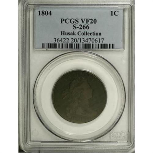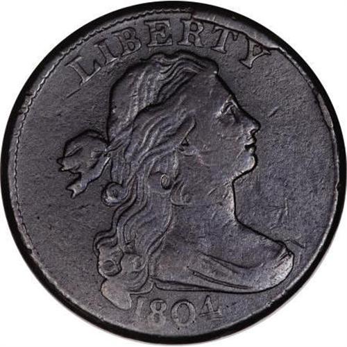 <B>1804 1C Middle Die State. VF20 PCGS. S-266b, B-1, R.2. </B></I> <B>Photo #59275. Our EAC Grade VG10.<BR><BR>Equivalents. </B></I>Proskey 1; Doughty 198; McGirk 1A; Clapp 1; EAC 1; <I>Encyclopedia </B></I>1760; PCGS #1504.<BR><B><BR>Variety. </B></I>Triple punched 4. High leaf below left corner of S. The obverse appears on S-266. The reverse appears on S-266.<BR><B><BR>Surfaces.</B></I> Mostly dark steel color with lighter reddish-brown on the highpoints of the obverse and reverse designs. The usual light handling marks are visible on the faintly rough surfaces. An attractive example of the important 1804 cent.<BR><B><BR>Die State III. </B></I>Better known as State "b" with an obverse rim break on RTY, but no reverse rim break. Breen lists four different die states, his first state requiring perfect, uncracked dies. The 1804 cents may not exist in the earliest die state. States II, III, and IV correspond with the earlier notation of S-266a, b, and c.<BR><BR><B>Commentary. </B></I>The middle die state is the scarcest of the three major, collectible die states of 1804 large cents. Due to the key-date status of the issue, third rarest date of the early large cents, some collectors are happy to have a single example in any of the three die states. Others, more serious in their copper pursuit, require three different examples.<BR><BR><B>Provenance. </B></I>No prior provenance has been located.<BR><BR><B>Personality. Philip Summers</B></I> was hired in 1804 as the Mint's doorkeeper, replacing his father who passed away early in the year. He was born in 1770 and died in 1824.<BR><BR><b>Shipping:</b> Coins & Currency (<a target="_blank" href="http://www.heritageauctions.com/common/shipping.php">view shipping information</a>)