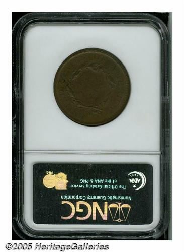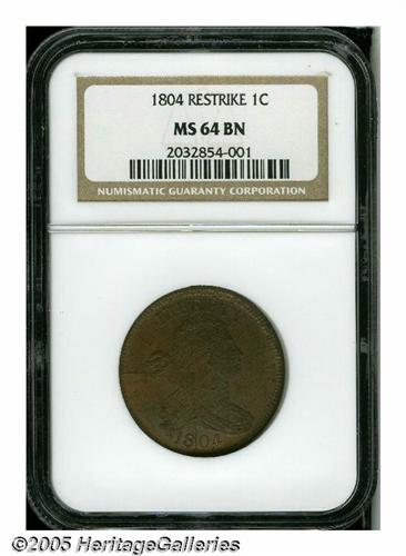 <B>1804<1C> Restrike MS64 Brown NGC.</B></I> A notorious issue that was struck circa 1860 with discarded and muled Mint dies. The rarity of the official 1804 cent, known from a single die pair, created demand that was partly met by this contemporaneously condemned private restrike. Struck from broken and heavily rusted dies. The chocolate-brown color is attractive, and the only post-strike detraction is some apparent lacquer reside at 9:30 on the reverse.