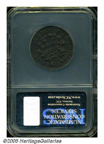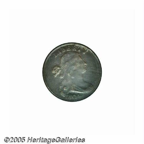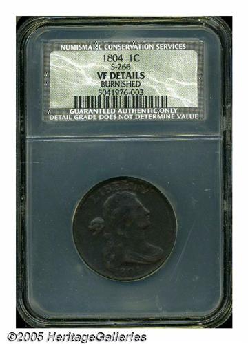 <B>1804<1C> VF Details, Burnished, NCS.</B></I> S-266, R.2. The late die state with prominent cuds above RTY and MERIC. Dark brown in color, this key date Large Cent is moderately corroded, and the obverse has been burnished to give the piece a more smooth appearance. Along with the 1799 and 1793, the 1804 ranks high on the want list of many early copper collectors. Only one scarce die variety is known, in contrast with the 1804 Half Cent, which is common and has thirteen die marriages.