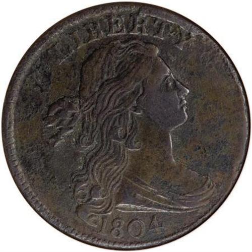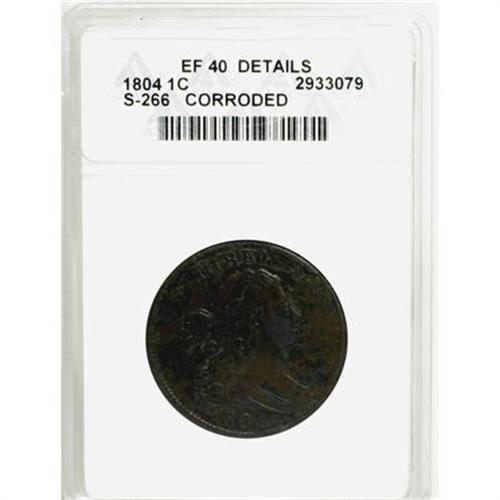 <B>1804 1C --Corroded--ANACS. XF40 Details</B></I> S-266c, B-1, R.2. The obverse and reverse each have large rim cuds, the obverse over RTY and the reverse over MERI. The late state is actually the most plentiful die state of the key 1804 large cent. This example is mostly olive and steel color with some unusual mustard patina on the reverse. EAC 10.<BR><BR><B>Coin Engraver:</B> Robert Scot<BR><BR><b>Shipping:</b> Coins & Currency (<a target="_blank" href="http://www.heritageauctions.com/common/shipping.php">view shipping information</a>)