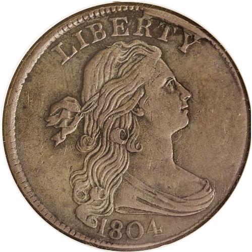 <B>1804<1C> XF45 NGC.</B></I> S-266, R.2. Die State IV. The die crack is pronounced over the RTY of LIBERTY, and another break is visible over MERIC on the reverse. While not a particularly scarce date, only one variety is available of the 1804. Thus, the collectibility of the 1804 is broken down by distinctive die states. This piece has darker brown surfaces with just slightly lighter highpoints over the devices. A couple of light scratches on the profile of Liberty are the only notable blemishes, the other marks present are consistent with the grade. EAC 25.