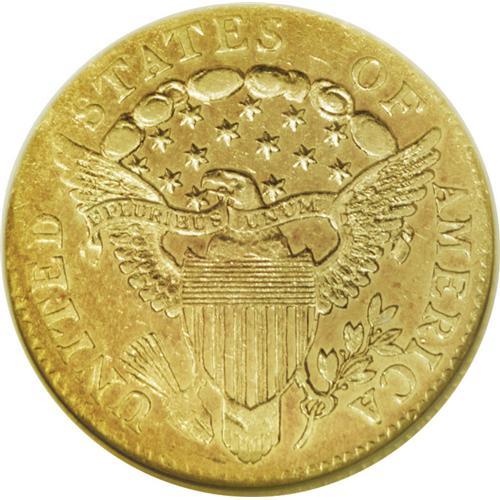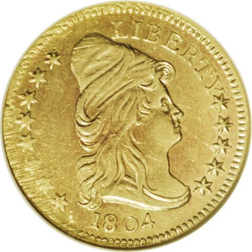 <B>1804 $2 1/2 14 Star Reverse AU58 NGC.</B></I> Breen-6119, BD-2, R.4. This is an impressive green-gold example with nearly full luster that is highlighted by splashes of attractive rose toning in the fields. The devices are all boldly defined as usual for this variety. Fine adjustment marks are seen along the lower left border of the obverse, creating weakness at the opposing point on the reverse. Dimes and quarter eagles dated 1804 are each known with both a 13 Stars reverse and a 14 Stars reverse. This blundered reverse die with 14 Stars was actually used to produce pieces in both denominations. Census: 23 in 58, 15 finer (1/07).<BR><BR><b>Shipping:</b> Coins & Currency (<a target="_blank" href="http://www.heritageauctions.com/common/shipping.php">view shipping information</a>)