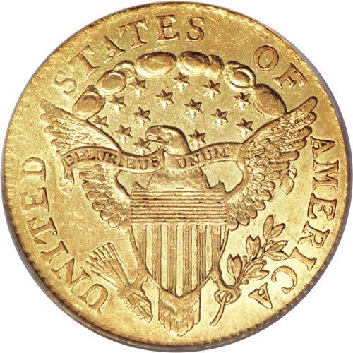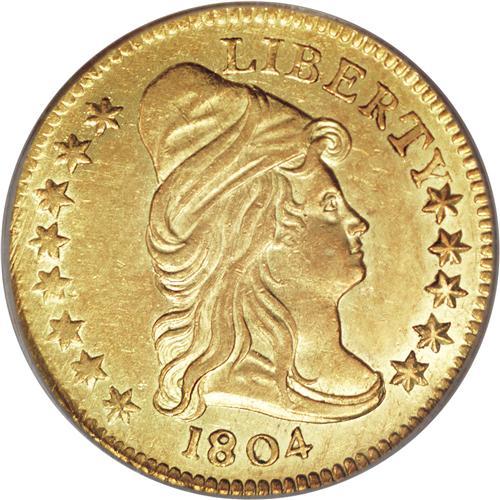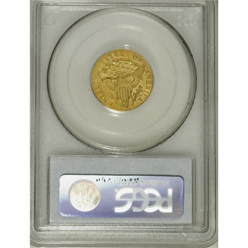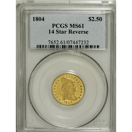 <B>1804 $2 1/2 14 Star Reverse MS61 PCGS.</B></I> BD-2, R.4. BD Obverse State c/Reverse State a. A late obverse die state, apparently only the second known along with the ANS coin. The top 12 stars appear as intersecting grids of seven stars each, and as Bass-Dannreuther puts it, "The only <BR>obert Scot quarter eagle reverse with an obvious cross pattern of stars." The authors estimate that of the recorded 3,327-piece mintage, from 2,300 to 2,800 pieces were of the R.4 14 Star reverse (est. 150-200 pieces existing), with the remaining 250 to 1,000 pieces the R.6 13 Star reverse (12 to 14 pieces believed extant). The two reverses shared a common obverse. On the 14 Star reverse, the leftmost top star is partially tucked away behind the eagle's left (facing) wing. John Dannreuther writes, "The reverse die of this pairing was used to strike the slightly rarer variety of 1804 dimes. Although the extra star may have been noticed by Mint personnel, a perfectly good die would not have been thrown away while it was serviceable. Thus, we have another cross-denominational use of a die."<BR> In this die state, a faint crack runs from the rim to the bust, just right of the date. A <I>second crack runs vertically upward in the left field to near star 7.</B></I> The BD reference notes of this state, "... the only example seen is the ANS coin, likely ex-Brock, from the J.P. Morgan donation, museum number 1908.93.414)." If this remains so since that was written, the present coin represents only the second known occurrence of this die state. A few trivial adjustment marks are noted at the obverse rim above stars 4-7, and there is considerable weakness on much of the reverse dentilation. Much luster radiates from the apricot-gold surfaces, and there are no individually distracting abrasions.<BR><BR><b>Shipping:</b> Coins & Currency (<a target="_blank" href="http://www.heritageauctions.com/common/shipping.php">view shipping information</a>)
