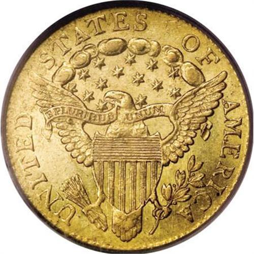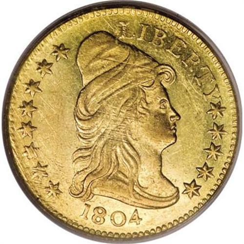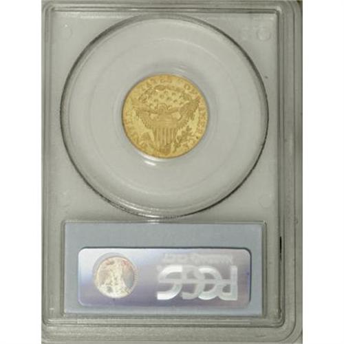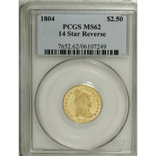 <B>1804 $2 1/2 14 Star Reverse MS62 PCGS.</B></I> Breen-6119, BD-2, R.4. This lovely example of the 1804 quarter eagle with 14 Star Reverse would make a fitting acquisition to accompany the James A. Stack 1804 14 Star Reverse dime (JR-2, R.5) that is also in the present sale, as both the dimes and quarter eagles were made with the same dies. This was purely an economic and practical measure at the early Mint, as so few quarter eagles were struck each year that there was little need for custom-produced dies for that single denomination. The reverse stars show an obvious cross pattern, the only Robert Scot quarter eagle reverse with such a star arrangement. In particular, the eagle's left (facing) wing partially obscures star 1, the top leftmost star. Walter Breen believed that this die was a leftover reverse from around 1798, but opinions are mixed, since the cross pattern is not as absolutely uniform as some of the earlier such dies. Opinions are similarly divided as to whether the quarter eagles or dimes were struck first, but both John Dannreuther and the John Reich dime researchers believe the dimes were struck last.<BR> The obverse die, which was used with both the BD-1 and BD-2 13 Star and 14 Star reverses, respectively, has a fairly large 1, a large 8, a wide, round 0, and a small 4 in the date. The present greenish-gold specimen shows considerable contrast between the fields and devices. Numerous parallel adjustment marks are noted through the center obverse, although they are scarcely visible without a loupe. The reverse shows a few light signs of contact under a loupe, none remotely worthy of singular mention, and yet both sides retain significant appeal, a combination of the radiant luster, fairly well executed strike, and absence of mentionable post-strike impairments. Population: 7 in 62, 2 finer (7/07).<BR><BR><B>Coin Engraver:</B> Robert Scot<BR><BR><b>Shipping:</b> Coins & Currency (<a target="_blank" href="http://www.heritageauctions.com/common/shipping.php">view shipping information</a>)