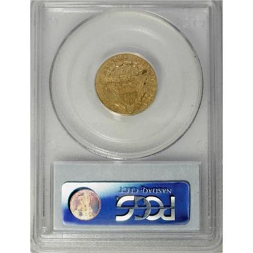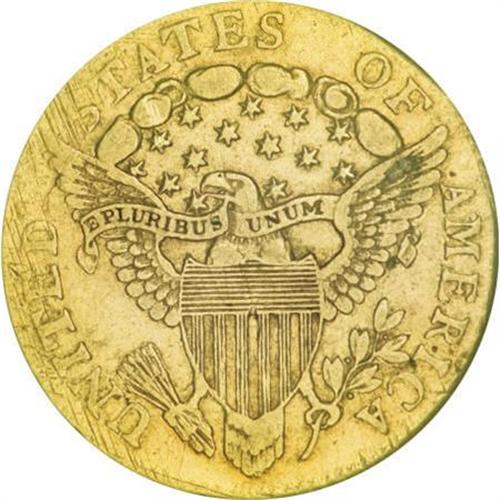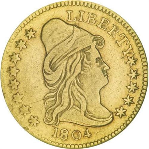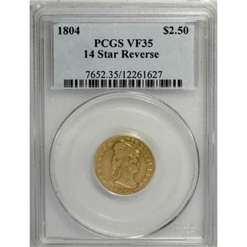 <B>1804 $2 1/2 14 Star Reverse VF35 PCGS.</B></I> Breen-6119, BD-2, R.4. An intriguing coin that could very well be an extremely rare mint error. On the obverse rim between the 7 o'clock and 9 o'clock positions, we observe two incuse features. Adjacent to star 1 there appears to be the upper portion of an L that is comparable in size and shape to that used in LIBERTY on this coin. Between star 3 and star 4, on the rim, we see the semblance of three star points. A quick overlay confirms that the location of the L in LIBERTY and star 8 would be positioned exactly as the impressions observed on this coin if a brockage had occurred. <BR> We can therefore conclude that this coin was struck over an already minted quarter eagle that was a brockage. Interestingly, the incuse details that do exist on this piece are found in the area that typically exhibits rim weakness on this variety. Since BD-1, the very rare 13 Star Reverse variety that has strong rim details, and BD-2, this coin, share the same obverse die, we can safely assume that the localized weakness at the lower left rim is due to a misaligned die problem. Therefore, the theory is that a flawed coin (a brockage) was fed back into the coining press to be properly struck. Since the gap between the dies was not set correctly, the localized force in the lower left obverse quadrant was not great enough to obliterate the details of the first strike in that area. This metal flow problem was exacerbated by the fact that the reverse adjustment marks, which are directly opposite the area of weakness on the obverse, reduced the amount of metal needed to properly fill the die in that area. <BR> Technically, this is a double-struck coin, since it was indeed coined twice, but it becomes more interesting in that the first strike produced a brockage. Double-struck errors on early gold coins are almost unheard of and, as such, quite valuable. However, we caution the bidder that this is not a confirmed error, although all evidence observed thus far is positive in nature. Close examination is mandatory, as is the drawing of one's own conclusion. <BR> Regardless of the aforementioned anomaly, this coin is a lovely early quarter eagle that saw limited duty in commercial channels. Delicate, straw-gold surfaces and well centered details combine to make this a picture-perfect 1804 two and one half. There are no egregious faults to be found on this coin, other than the previously mentioned adjustment marks, integral to early gold issues, and a tiny piece of debris observed on the eagle's right wing (facing), but it is hardly noticeable without the aid of magnification. BD-2 is by far the more available of the two 1804 varieties, although it is still very scarce. The Bass-Dannreuther reference suggests that only 150 to 200 examples survived the original mintage of approximately 2,500 coins--hardly enough to go around. And collectors face further pressure due to the demand for coins bearing one of numismatics' most popular dates: 1804.<BR><BR><B>Coin Engraver:</B> Robert Scot<BR><BR><b>Shipping:</b> Coins & Currency (<a target="_blank" href="http://www.heritageauctions.com/common/shipping.php">view shipping information</a>)