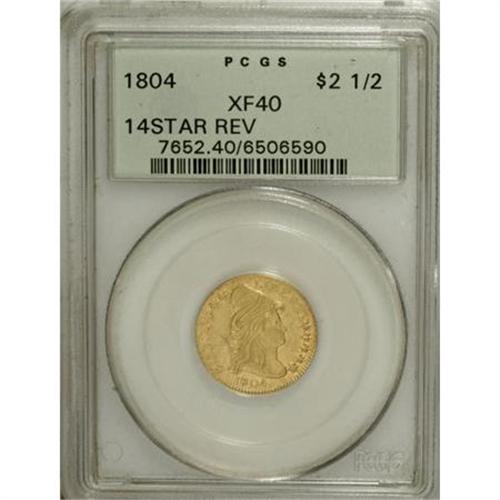 <B>1804 $2 1/2 14 Star Reverse XF40 PCGS.</B></I> Breen-6119, BD-2, R.4. The popular blundered die with 14 stars above the eagle instead of the proper 13 stars. One of only two 1804-dated varieties, and since the 13 Star Reverse (BD-1) is High R.6, BD-2 is integral to a date collection.<BR> This is a predominantly straw-gold example with glimpses of orange toning near the borders. Generally sharply struck, although due to the die alignment, the obverse is softly defined at 8 o'clock on the obverse, and at 10 o'clock on the reverse. Lustrous and splendidly detailed for the XF40 grade. The obverse has a faint vertical hairlines, and the left obverse field has a few pinscratches. Encapsulated in a green label holder.<BR><I>From The Chandler Collection.</B></I><BR><BR><B>Coin Engraver:</B> Robert Scot<BR><BR><b>Shipping:</b> Coins & Currency (<a target="_blank" href="http://www.heritageauctions.com/common/shipping.php">view shipping information</a>)