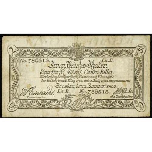 <style type="text/css"> body, td, th { font-family: Arial, Helvetica, sans-serif; font-size: 12px; color: #482424; margin: 0px; padding: 0px; } #header { background-image: url(http://www.bowersandmerena.com/ebay/images/template_v3_01.gif); clear: both; background-color: #590303; border-top-width: 2px; border-top-style: solid; border-top-color: #B38C4F; } #header #header_wrapper { height: 75px; clear: both; width: 800px; margin-right: auto; margin-left: auto; background-image: url(http://www.bowersandmerena.com/ebay/images/template_v3_03.gif); background-repeat: no-repeat; background-position: right; color: #F3EDCC; } #header #header_wrapper #header_logo { float: left; height: 75px; width: 444px; background-image: url(http://www.bowersandmerena.com/ebay/images/template_v3_02.gif); background-repeat: no-repeat; font-size: 10px; text-transform: capitalize; color: #B38C4F; } #header #header_wrapper #header_right { float: left; height: 75px; width: 356px; text-align: right; } #header #header_wrapper #header_right #headerLoginBtn { margin-bottom: 30px; } #header #header_wrapper #header_right input#txtSearch { color: #B49056; border: 1px solid #B49056; width: 175px; padding-top: 3px; padding-right: 3px; padding-bottom: 4px; padding-left: 3px; } #nav { height: 37px; background-image: url(http://www.bowersandmerena.com/ebay/images/template_v3_05.gif); clear: both; } #nav #nav_wrapper { height: 35px; width: 800px; margin-right: auto; margin-left: auto; border-left-width: 1px; border-left-style: solid; border-left-color: #B38C4F; } #nav #nav_wrapper a { padding-right: 15px; padding-left: 15px; border-right-width: 1px; border-right-style: solid; border-right-color: #B38C4F; height: 25px; padding-top: 10px; display: block; float: left; text-decoration: none; font-weight: bold; color: #5D0303; } #nav #nav_wrapper a:hover { color: #B38C4F; } #nav #nav_wrapper #search { float: right; padding-top: 7px; } #nav #nav_wrapper #search #txtSearch { font-family: Arial, Helvetica, sans-serif; font-size: 10px; text-transform: uppercase; color: #D2AE75; border: 1px solid #B38C4F; padding: 3px; } #content_bgd { background-image: url(http://www.bowersandmerena.com/ebay/images/template_v3_09.gif); background-repeat: repeat-y; background-position: center; padding-top: 15px; padding-bottom: 15px; background-color: #FBFBDB; } #content_wrapper { clear: both; height: auto; width: 800px; margin-right: auto; margin-left: auto; } .LotDetailWhite { line-height:normal; font-size:13px; font-family: arial,helvetica,sans-serif; color: White; font-weight: bold; } .LotDetailInformation { line-height:normal; font-size: 13px; font-family: arial,helvetica,sans-serif; } .LotDetailMessage { line-height:normal; font-size: 13px; font-family: arial,helvetica,sans-serif; color: red; } } tr.HeaderAuctionTitle td { color: #000000; font-weight: bold; padding: 2px; background-image: url(http://www.bowersandmerena.com/ebay/images/template_v3_05.gif); background-repeat: repeat-x; border-bottom-width: 1px; border-bottom-style: solid; border-bottom-color: #B38C4F; } table.AuctionSummary a, table.AuctionSummary a:link, table.AuctionSummary a:visited { color: #0000FF; text-decoration: none; } } td.tableHeaderLeft { border-left-width: 1px; border-left-style: solid; border-left-color: #B38C4F; } td.tableHeaderRight { border-right-width: 1px; border-right-style: solid; border-right-color: #B38C4F; } td.tableCellMiddle { border-left-width: 1px; border-left-style: solid; border-left-color: #B38C4F; border-right-width: 1px; border-right-style: solid; border-right-color: #B38C4F; padding: 5px; } tr.footer td { border-top-width: 1px; border-top-style: solid; border-top-color: #B38C4F; } </style> </head> <body> <div id="header"> <div id="header_wrapper"> <div id="header_logo"> </div> <div id="header_right"> </div> </div> </div> <div id="nav"> <div id="nav_wrapper"> <a href="http://www.bowersandmerena.com">Our eBayLive Auctions</a> <a href="#PaymentInfo">Payment Information</a> <a href="#ShippingInfo">Shipping Information</a> <a href="#About">About Bowers and Merena</a> </div> </div> <div id="content_bgd"> <div id="content_wrapper"> <table width="100%" border="0" cellpadding="5" cellspacing="0" class="AuctionSummary"> <tbody> <tr class="HeaderAuctionTitle" style="height: 25px;"> <td align="left" class="tableHeaderLeft" > </td> <td align="center" class="tableHeaderRight"> <span style="font-size: large;">Lot #2820. Specialized Germany. 1804 2 Reichsthaler. Royal Electoral Saxon Treasury Bill. Fine.</span> </td> </tr> <tr> <td colspan="3" class="tableCellMiddle"> PS-613b. A great item from an early date with even circulation that shows great appeal for the grade. This note has impressive watermarks that show how early this process was utilized. They show the denomination and read "callen billet."