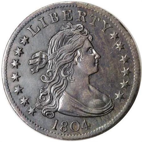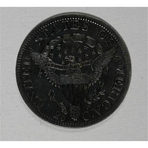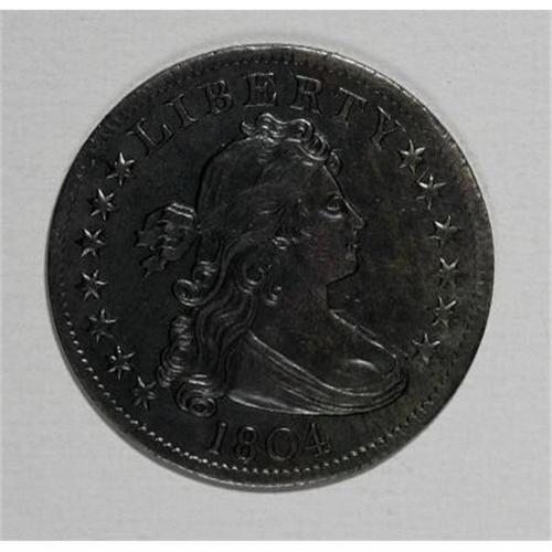 <B>1804 25C AU58 Cleaned, Retoned Uncertified.</B></I> B-1, R.4. The 1804 is less famous than the 1796, and trades for significantly less in all grades, yet the 1804 is clearly the scarcer of the two rarities, particularly in Mint State. The present impressive piece has well struck major devices, although the obverse stars lack centrils and the two highest reverse stars are also soft. Thorough evaluation with the aid of a loupe cannot locate any mentionable marks, but the fields display prominent clash marks. The surfaces are subdued, and the apple-green and salmon-pink toning conceals a relatively mild cleaning.<BR><BR><B>Coin Engraver:</B> Robert Scot<BR><BR><b>Shipping:</b> Coins & Currency (<a target="_blank" href="http://www.heritageauctions.com/common/shipping.php">view shipping information</a>)