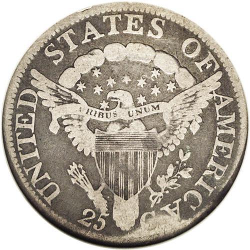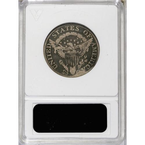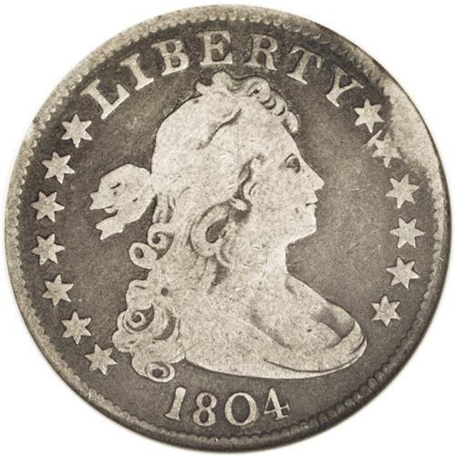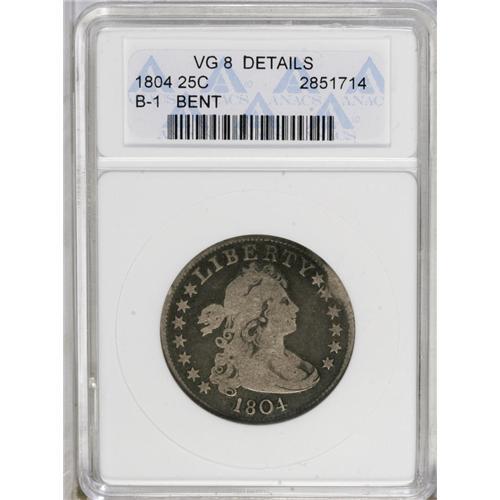 <B>1804<25C>--Bent--ANACS. VG8 Details.</B></I> B-1, R.4. The edge is damaged at 2 o'clock on the obverse, and at 5 o'clock on the reverse, otherwise the surfaces are free of mentionable abrasions. Deep steel-gray color overall the highpoints present a lighter, contrasting silver-gray appearance. The low mintage 1804 quarter is a famous introduction to the short-lived Heraldic Eagle series.
