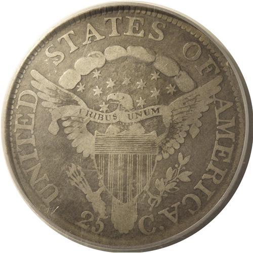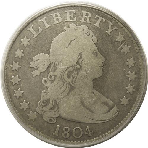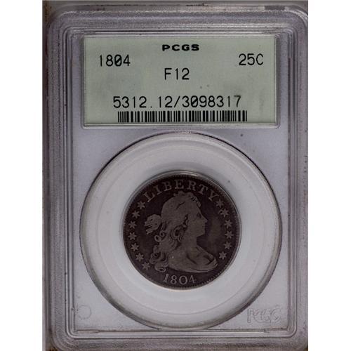 <B>1804<25C> Fine 12 PCGS.</B></I> B-1, R.4. This variety is attributed by the low 4 in the date, the relatively wide space between the B and E in LIBERTY, and a small die cut between stars 8 and 9. This pleasing, original piece displays medium gray fields that highlight lighter gray design elements. Nice detail for the grade, including strong definition in the last ten letters of the reverse motto. A small area of fine pinscratches on the rim near the U of UNITED are not all that distracting, and serve to identify the coin. Housed in an early generation holder.
