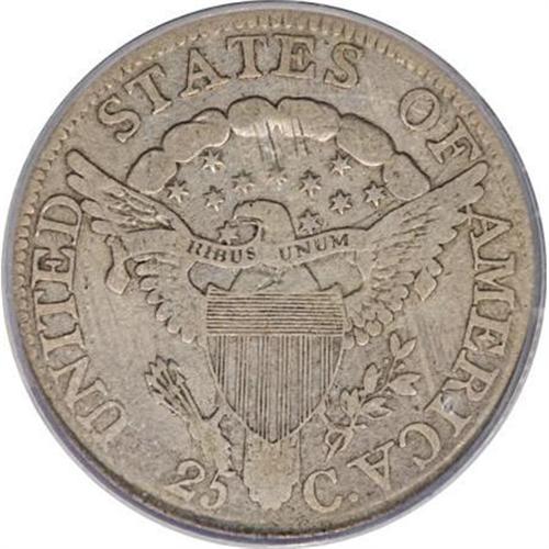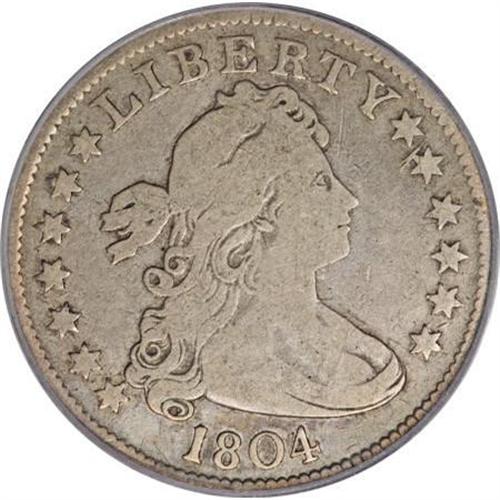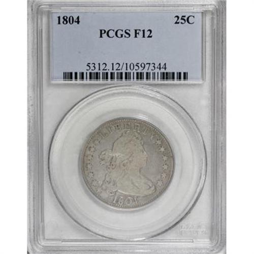 <B>1804 25C Fine 12 PCGS.</B></I> B-1, R.4. The mintage and rarity of the 1804 is similar to that of the more heralded 1796, and the 1804 is clearly rarer in Mint State. Yet the 1804 trades at much lower levels, probably because it is more available as a type due to the comparatively plentiful 1805 to 1807 dates. A subdued slate-gray example with a few trivial adjustment marks near the clouds and a single faded mark near the forehead curl.<BR><BR><B>Coin Engraver:</B> Robert Scot<BR><BR><b>Shipping:</b> Coins & Currency (<a target="_blank" href="http://www.heritageauctions.com/common/shipping.php">view shipping information</a>)