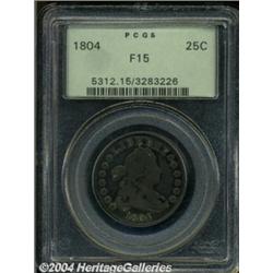 <table><tbody><tr><td><table> <TR><TD width="100%"><TABLE cellSpacing=1 cellPadding=3 width="100%" border=0><TBODY><TR><TD width="100%" bgColor=#79735c><FONT face=arial color=#ffffff size=3><B>Description</B> </FONT></TD></TR><TR><TD width="100%" bgColor=#ffffff><FONT face=arial size=2><B>1804 25C Fine 15 PCGS.</B></I> B-1, High R.3. With only 6,738 pieces produced, the 1804 is one of the premier rarities in the early quarter series. Examples are highly sought after in all grades. This is a very deeply toned piece that has slightly lighter accents over the reverse devices. Evenly worn with a couple of very light scratches in the left obverse field. </FONT></TD></TR></TBODY></TABLE></TD></TR></TBODY></TABLE><BR><A name=PricesRealized></A><TABLE cellSpacing=0 cellPadding=0 width="100%" bgColor=#000000 border=0><TBODY><TR><TD width="100%"><TABLE cellSpacing=1 cellPadding=3 width="100%" border=0><TBODY><TR><TD width="100%" bgColor=#79735c><A name=PR><FONT face=arial color=#ffffff size=3><B>Previous Prices from Heritage Auctions</B> </FONT></A></TD></TR><TR><TD bgColor=#f6f6ed><TABLE cellSpacing=0 cellPadding=0 width="100%" border=1><TBODY><TR><TD align=middle width="33%"><B>Date</B></TD><TD align=middle width="33%"><B>Service</B></TD><TD align=middle width="33%"><B>Price</B></TD></TR><TR bgColor=whitesmoke><TD width="33%"><B>01/07/2004</B></TD><TD width="33%">PCGS</TD><TD width="33%">$12,650.00</TD></TR><TR bgColor=whitesmoke><TD width="33%"><B>10/01/1995</B></TD><TD width="33%">PCGS</TD><TD width="33%">$1,650.00</TD></TR></TBODY></TABLE></TD></TR><TR><TD bgColor=#ffffff><FONT face=arial size=1 ?>PLEASE NOTE: All prices realized reflect the final hammer price PLUS the buyer's premium in auctions that charge a buyer's premium. Each item has a notation at the top of the listing indicating whether that lot included a buyer's premium. Example: A item that sells with a final hammer price of $100 and a 20% buyer's premium will display with a price realized of $120. All information listed is intended to be as accurate as possible, but errors are possible. Please use this guide carefully and inform us of any inaccuracies. </FONT></TD></TR></TBODY></TABLE></TD></TR></TBODY></TABLE><BR><TABLE cellSpacing=0 cellPadding=0 width="100%" bgColor=#000000 border=0><TBODY><TR><TD width="100%"><TABLE cellSpacing=1 cellPadding=3 width="100%" border=0><TBODY><TR><TD width="100%" bgColor=#79735c colSpan=6><FONT face=arial color=#ffffff size=3><B>Price Guide*</B> </FONT></TD></TR><TR bgColor=#f6f6ed><TD align=middle><B>Grade</B> </TD><TD align=middle><B>Coin World<BR>(Trends)</B> </TD><TD align=middle><B>Numismedia<BR>Retail</B> </TD><TD align=middle><B>Numismedia<BR>Wholesale</B> </TD><TD align=middle><B>Coin<BR>Universe</B> </TD><TD align=middle><B>Heritage<BR>Value Index</B> </TD></TR><TR bgColor=#ffffff><TD align=middle>12</TD><TD align=right>---</TD><TD align=right>---</TD><TD align=right>$2,350.00</TD><TD align=right>$2,100.00</TD><TD align=right>$1,905.00</TD></TR><TR style="FONT-WEIGHT: bold" bgColor=#cccfdd><TD align=middle>15</TD><TD align=right>---</TD><TD align=right>---</TD><TD align=right>---</TD><TD align=right>---</TD><TD align=right>$2,248.13</TD></TR><TR bgColor=#ffffff><TD align=middle>20</TD><TD align=right>---</TD><TD align=right>---</TD><TD align=right>$3,425.00</TD><TD align=right>---</TD><TD align=right>$2,820.00</TD></TR><TR bgColor=#ffffff><TD colSpan=6><FONT size=1>*All information listed is intended to be as accurate as possible, but errors are possible. No item may be returned or refused based on this information which is provided as a service to our customers. You should contact each pricing source directly to determine the accuracy of this information. </FONT></TD></TR></TBODY></TABLE></TD></TR></TBODY></TABLE><BR><TABLE cellSpacing=0 cellPadding=0 width="100%" bgColor=#000000 border=0><TBODY><TR><TD width="100%"><TABLE cellSpacing=1 cellPadding=3 width="100%" border=0><TBODY><TR><TD width="100%" bgColor=#79735c><FONT face=arial color=#ffffff size=3><B>Population Guide</B> </FONT></TD></TR><TR bgColor=#ffffff><TD align=middle><!-- Begin Output of Population Grid--><TABLE cellSpacing=0 cellPadding=0 width="100%" border=0><TBODY><TR><TD vAlign=center><TABLE cellSpacing=0 width="100%" border=1 cellsadding="3"><TBODY><TR><TD vAlign=center><TABLE cellSpacing=0 cellPadding=3 width="100%" border=1><TBODY><TR><TD vAlign=center align=middle bgColor=#f0f1e8 colSpan=2 <CENTER><FONT face=Arial size=2><B>PCGS Pop </B></FONT><CENTER></CENTER></TD><TD vAlign=center align=middle bgColor=#f0f1e8 colSpan=2><CENTER><FONT face=Arial size=2><B>NGC Pop</B></CENTER></FONT></TD></TR><TR><TD vAlign=center><FONT face=Arial size=2>(15)</FONT> </TD><TD vAlign=center align=right><FONT face=Arial size=2>17</FONT> </TD><TD vAlign=center><FONT face=Arial size=2>(15)</FONT> </TD><TD vAlign=center align=right><FONT face=Arial size=2>3</FONT> </TD></TR><TR><TD vAlign=center><FONT face=Arial size=2>(>15)</FONT> </TD><TD vAlign=center align=right><FONT face=Arial size=2>43</FONT> </TD><TD vAlign=center><FONT face=Arial size=2>(>15)</FONT> </TD><TD vAlign=center align=right><FONT face=Arial size=2>28</FONT> </TD></TR></TBODY></TABLE></TD></TR></TBODY></TABLE></TD></TR></TBODY></TABLE><!-- End Output of Population Grid--></TD></TR></TBODY></TABLE></TD></TR></TBODY></TABLE><BR><TABLE cellSpacing=0 cellPadding=0 width="100%" bgColor=#000000 border=0><TBODY><TR> <font color='#000000'><span style='background-color: #FFFFFF'><td bgcolor='#FFFFFE'> Important notice: Heritage usually auctions material at the rate of 200-250 lots per hour. On some occasions eBay Live bid software or the Internet may not be able to keep up with the pace of the auction. We recommend placing a realistic absentee bid now as insurance to avoid disappointment. Occasionally the auctioneer may eliminate or reject an eBay Live bid, and the auctioneer may also reopen a lot after the close of the eBay live bidding (usually because we missed an audience bid)