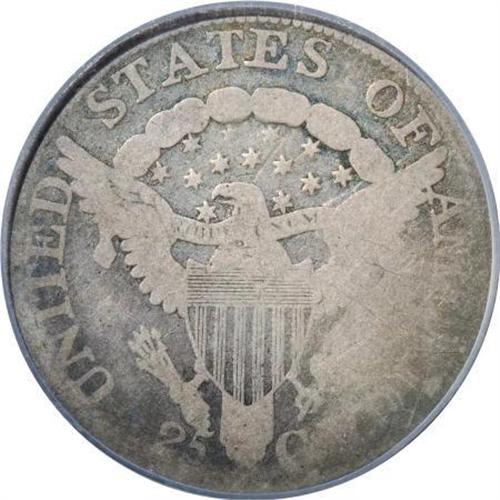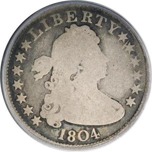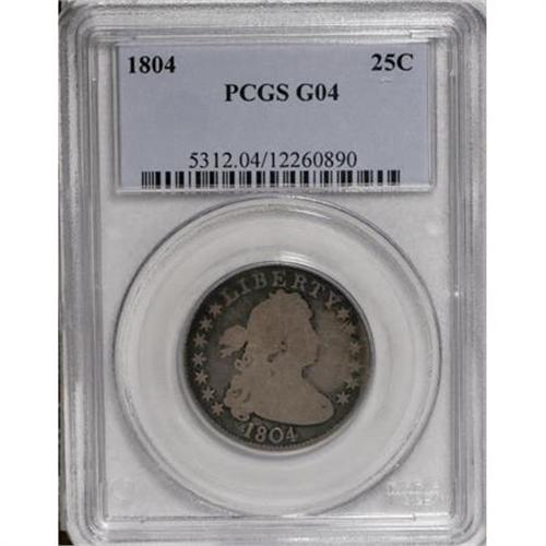 <B>1804 25C Good 4 PCGS.</B></I> B-1, R.4. A problem-free, but well-worn example of this better date Bust quarter. The date is full and distinct, but Liberty has been reduced to an outline and the portion of the reverse near MERICA is flat, with parts of the denomination worn away. B-1 is the more common of the two varieties of the year.<BR><BR><B>Coin Engraver:</B> Robert Scot<BR><BR><b>Shipping:</b> Coins & Currency (<a target="_blank" href="http://www.heritageauctions.com/common/shipping.php">view shipping information</a>)