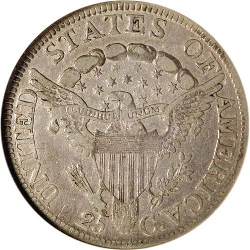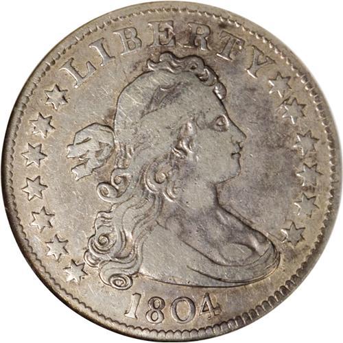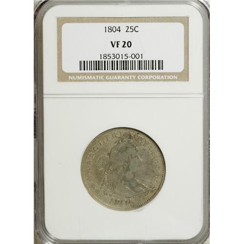 <B>1804 25C VF20 NGC.</B></I> B-1, R.4. Tawny-gold and powder-blue patina visit this glossy and evenly circulated key date quarter. A few minor marks on the right obverse field require no further discussion. 1804 was the first date of the Heraldic Eagle for quarters, although it had been introduced earlier on the half dime, dime, half dollar, and dollar.<BR><BR><b>Shipping:</b> Coins & Currency (<a target="_blank" href="http://www.heritageauctions.com/common/shipping.php">view shipping information</a>)