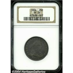 <table><tbody><tr><td><table> <TR><TD width="100%"><TABLE cellSpacing=1 cellPadding=3 width="100%" border=0><TBODY><TR><TD width="100%" bgColor=#79735c><FONT face=arial color=#ffffff size=3><B>Description</B> </FONT></TD></TR><TR><TD width="100%" bgColor=#ffffff><FONT face=arial size=2><B>1804 25C VF25 PCGS.</B></I> B-1, High R.3. Even though quarter dollar production began in 1796, the second issue of this denomination was not delivered until 1804. This date is a well known rarity and is sought after in all grades. This is an especially pleasing coin for the grade whose only mentionable surface flaws are light die clashing and a shallow scratch across Liberty's bust. Moderate gray and blue toning is accented by light tan coloration over the highpoints of the devices. </FONT></TD></TR></TBODY></TABLE></TD></TR></TBODY></TABLE><BR><A name=PricesRealized></A><TABLE cellSpacing=0 cellPadding=0 width="100%" bgColor=#000000 border=0><TBODY><TR><TD width="100%"><TABLE cellSpacing=1 cellPadding=3 width="100%" border=0><TBODY><TR><TD width="100%" bgColor=#79735c><A name=PR><FONT face=arial color=#ffffff size=3><B>Previous Prices from Heritage Auctions</B> </FONT></A></TD></TR><TR><TD bgColor=#f6f6ed><TABLE cellSpacing=0 cellPadding=0 width="100%" border=1><TBODY><TR><TD align=middle width="33%"><B>Date</B></TD><TD align=middle width="33%"><B>Service</B></TD><TD align=middle width="33%"><B>Price</B></TD></TR><TR bgColor=whitesmoke><TD width="33%"><B>07/01/1997</B></TD><TD width="33%">PCGS</TD><TD width="33%">$2,310.00</TD></TR></TBODY></TABLE></TD></TR><TR><TD bgColor=#ffffff><FONT face=arial size=1 ?>PLEASE NOTE: All prices realized reflect the final hammer price PLUS the buyer's premium in auctions that charge a buyer's premium. Each item has a notation at the top of the listing indicating whether that lot included a buyer's premium. Example: A item that sells with a final hammer price of $100 and a 20% buyer's premium will display with a price realized of $120. All information listed is intended to be as accurate as possible, but errors are possible. Please use this guide carefully and inform us of any inaccuracies. </FONT></TD></TR></TBODY></TABLE></TD></TR></TBODY></TABLE><BR><TABLE cellSpacing=0 cellPadding=0 width="100%" bgColor=#000000 border=0><TBODY><TR><TD width="100%"><TABLE cellSpacing=1 cellPadding=3 width="100%" border=0><TBODY><TR><TD width="100%" bgColor=#79735c colSpan=6><FONT face=arial color=#ffffff size=3><B>Price Guide*</B> </FONT></TD></TR><TR bgColor=#f6f6ed><TD align=middle><B>Grade</B> </TD><TD align=middle><B>Coin World<BR>(Trends)</B> </TD><TD align=middle><B>Numismedia<BR>Retail</B> </TD><TD align=middle><B>Numismedia<BR>Wholesale</B> </TD><TD align=middle><B>Coin<BR>Universe</B> </TD><TD align=middle><B>Heritage<BR>Value Index</B> </TD></TR><TR bgColor=#ffffff><TD align=middle>20</TD><TD align=right>---</TD><TD align=right>---</TD><TD align=right>$3,425.00</TD><TD align=right>---</TD><TD align=right>$2,820.00</TD></TR><TR style="FONT-WEIGHT: bold" bgColor=#cccfdd><TD align=middle>25</TD><TD align=right>---</TD><TD align=right>---</TD><TD align=right>---</TD><TD align=right>---</TD><TD align=right>$3,543.75</TD></TR><TR bgColor=#ffffff><TD align=middle>30</TD><TD align=right>---</TD><TD align=right>---</TD><TD align=right>---</TD><TD align=right>---</TD><TD align=right>$4,267.50</TD></TR><TR bgColor=#ffffff><TD colSpan=6><FONT size=1>*All information listed is intended to be as accurate as possible, but errors are possible. No item may be returned or refused based on this information which is provided as a service to our customers. You should contact each pricing source directly to determine the accuracy of this information. </FONT></TD></TR></TBODY></TABLE></TD></TR></TBODY></TABLE><BR><TABLE cellSpacing=0 cellPadding=0 width="100%" bgColor=#000000 border=0><TBODY><TR><TD width="100%"><TABLE cellSpacing=1 cellPadding=3 width="100%" border=0><TBODY><TR><TD width="100%" bgColor=#79735c><FONT face=arial color=#ffffff size=3><B>Population Guide</B> </FONT></TD></TR><TR bgColor=#ffffff><TD align=middle><!-- Begin Output of Population Grid--><TABLE cellSpacing=0 cellPadding=0 width="100%" border=0><TBODY><TR><TD vAlign=center><TABLE cellSpacing=0 width="100%" border=1 cellsadding="3"><TBODY><TR><TD vAlign=center><TABLE cellSpacing=0 cellPadding=3 width="100%" border=1><TBODY><TR><TD vAlign=center align=middle bgColor=#f0f1e8 colSpan=2 <CENTER><FONT face=Arial size=2><B>PCGS Pop </B></FONT><CENTER></CENTER></TD><TD vAlign=center align=middle bgColor=#f0f1e8 colSpan=2><CENTER><FONT face=Arial size=2><B>NGC Pop</B></CENTER></FONT></TD></TR><TR><TD vAlign=center><FONT face=Arial size=2>(25)</FONT> </TD><TD vAlign=center align=right><FONT face=Arial size=2>6</FONT> </TD><TD vAlign=center><FONT face=Arial size=2>(25)</FONT> </TD><TD vAlign=center align=right><FONT face=Arial size=2>2</FONT> </TD></TR><TR><TD vAlign=center><FONT face=Arial size=2>(>25)</FONT> </TD><TD vAlign=center align=right><FONT face=Arial size=2>28</FONT> </TD><TD vAlign=center><FONT face=Arial size=2>(>25)</FONT> </TD><TD vAlign=center align=right><FONT face=Arial size=2>23</FONT> </TD></TR></TBODY></TABLE></TD></TR></TBODY></TABLE></TD></TR></TBODY></TABLE><!-- End Output of Population Grid--></TD></TR></TBODY></TABLE></TD></TR></TBODY></TABLE><BR><TABLE cellSpacing=0 cellPadding=0 width="100%" bgColor=#000000 border=0><TBODY><TR> <font color='#000000'><span style='background-color: #FFFFFF'><td bgcolor='#FFFFFE'> Important notice: Heritage usually auctions material at the rate of 200-250 lots per hour. On some occasions eBay Live bid software or the Internet may not be able to keep up with the pace of the auction. We recommend placing a realistic absentee bid now as insurance to avoid disappointment. Occasionally the auctioneer may eliminate or reject an eBay Live bid, and the auctioneer may also reopen a lot after the close of the eBay live bidding (usually because we missed an audience bid), and may rej