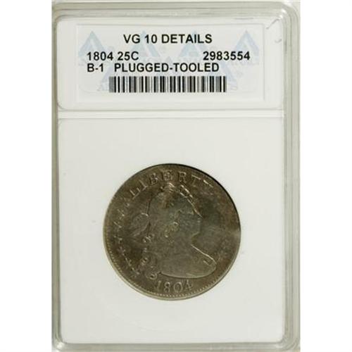<B>1804 25C --Plugged, Tooled--ANACS. VG10 Details.</B></I> B-1, R.4. Breen Die State II with clash marks above the bosom and the right (facing) wing. Apparently a fairly large hole was present near 12 o'clock. This has been plugged, and the upper obverse is re-engraved with some skill. No attempt has been made to re-engrave the large circular plug on the lower reverse. Both sides have been whizzed, and the obverse rim has a small ding at 2:30. A rare low mintage date.<BR><BR><b>Shipping:</b> Coins & Currency (<a target="_blank" href="http://www.heritageauctions.com/common/shipping.php">view shipping information</a>)