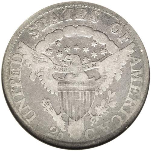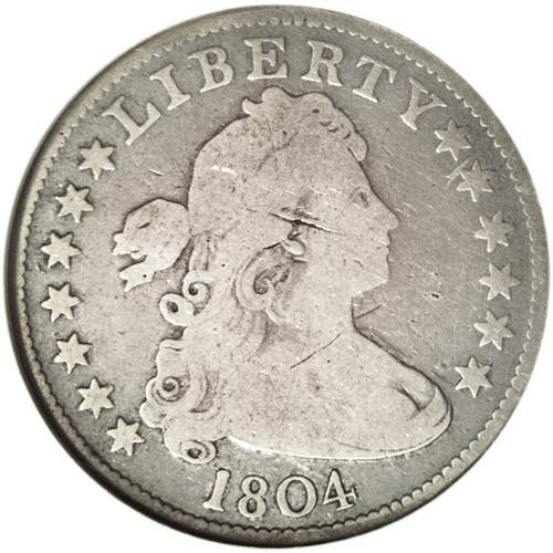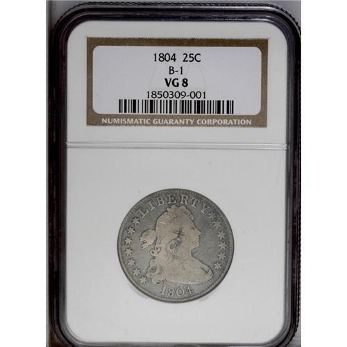 <B>1804<25C> VG8 NGC.</B></I> B-1, R.4. This variety is confirmed by the low 4 in the date, the relatively wide space between the B and E in LIBERTY, and a small die flaw between stars 8 and 9. A very scarce early quarter with a mintage of only 6,738 pieces. This is a pleasing example for the grade with very light color on each side. The lower half of the reverse is worn into the rims. Otherwise, a full rims coin with all the major design elements present. Several wispy pinscratches are noted on the reverse, while a couple of deeper scratches are observed on Liberty's portrait. A key coin in all grades.