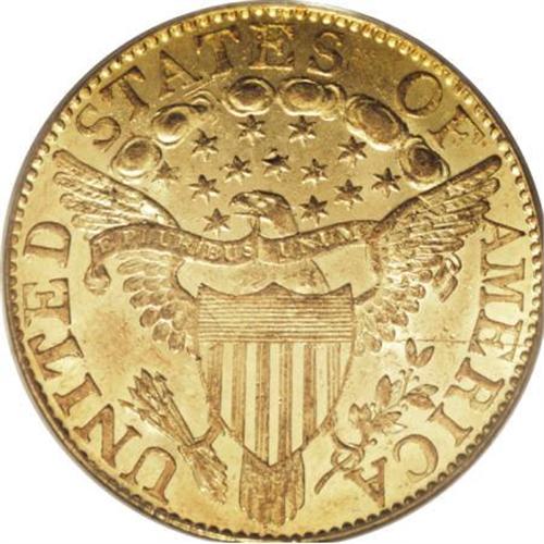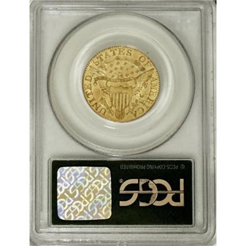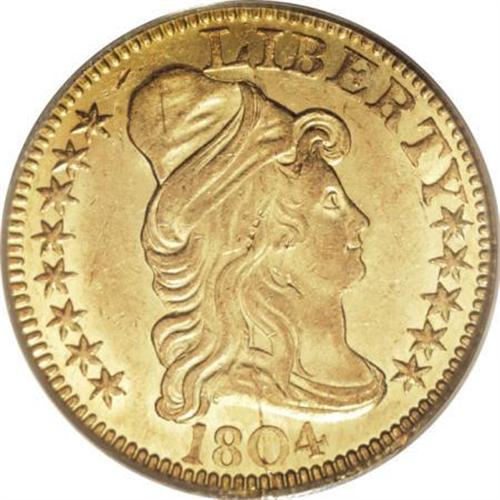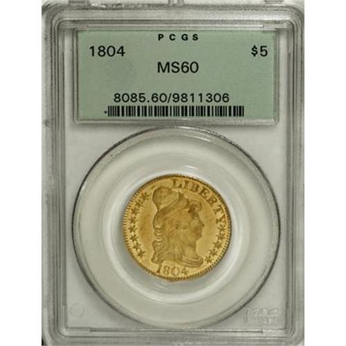 <B>1804 $5 Small 8 MS60 PCGS.</B></I> Breen-6443, BD-2, High R.4. The obverse has a bisecting crack from 12 to 6 o'clock, and the reverse has radial cracks at 3 and 10 o'clock that join within the eagle's shield. The T in UNITED is repunched, with the initial T punch perfect. The other Ts in the reverse legend have a missing right foot. This suggests the T punch became defective while repunching the T in UNITED.<BR>This sun-gold early half eagle has pleasing luster and a consistently crisp strike. The central obverse exhibits a few unimportant marks, but the overall look is surprisingly unblemished for the MS60 grade. Certified in a green label holder.<BR><BR><B>Coin Engraver:</B> Robert Scot<BR><BR><b>Shipping:</b> Coins & Currency (<a target="_blank" href="http://www.heritageauctions.com/common/shipping.php">view shipping information</a>)