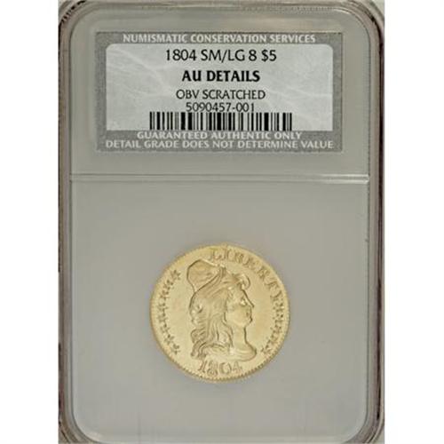 <B>1804 $5 Small 8 Over Large 8--Obverse Scratched--NCS. AU Details.</B></I> Breen-6442, BD-7, R.4. Both sides are clashed, similar to Bass-Dannreuther b-b, but no reverse die cracks are visible. Although undesignated as such, this is a prooflike example with only a trace of friction on Liberty's cap. The left obverse has four hair-thin pinscratches, but one is faint and another is concealed within the cap. Their overall impact is relatively small, and the present half eagle remains a desirable representative of the Heraldic Eagle type.<BR><BR><B>Coin Engraver:</B> Robert Scot<BR><BR><b>Shipping:</b> Coins & Currency (<a target="_blank" href="http://www.heritageauctions.com/common/shipping.php">view shipping information</a>)