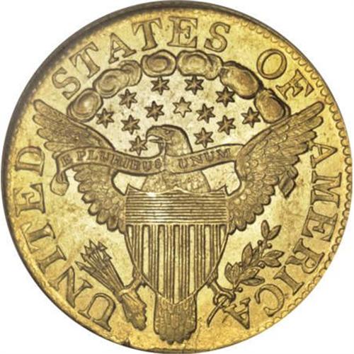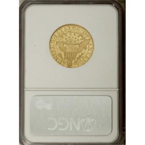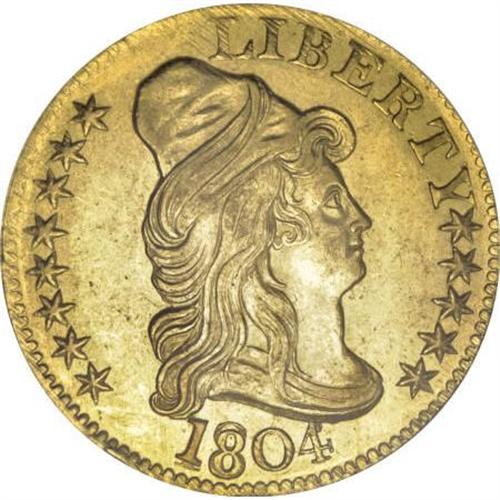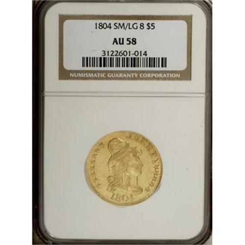 <B>1804 $5 Small 8 Over Large 8 AU58 NGC.</B></I> Breen-6442, BD-7, R.4. According to Breen (1988), "[Robert] Scot first punched 180 into the die blank, using the extra-large numeral punches intended for the $10 coins. When he positioned the 4 for hammering in next to the 0, he noticed that there was not enough room for it. The next step was to have this die blank reground to efface part of the large 180, and to enter the date from smaller punches, from the font in use for cent dies." The repunching is particularly obvious on the 8, hence the name usually given to this variety, but it is also plainly evident on the 1 and a bit more subtly visible on the 0, both of which are repunched south. The variety is highly sought after due to its presence in the <I>Guide Book</B></I>. This piece is an attractive lemon-gold color, with much of the luster still visible. The strike is complete, with notable weakness confined to LI, where a few light adjustment marks can also be seen. There are no distracting abrasions on the surfaces, which, combined with the minimal nature of the wear, leave this coin with a high degree of eye appeal.<BR><I>Ex: Bowers and Merena (8/91), lot 540. The flip is included with the lot.<BR>From The John Stimson, Sr. Collection, Part One.</B></I><BR><BR><B>Coin Engraver:</B> Robert Scot<BR><BR><b>Shipping:</b> Coins & Currency (<a target="_blank" href="http://www.heritageauctions.com/common/shipping.php">view shipping information</a>)