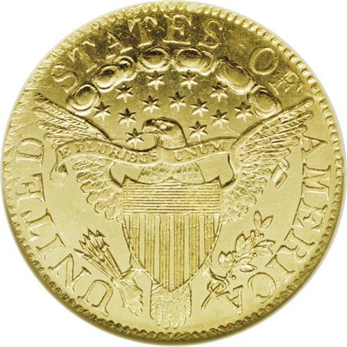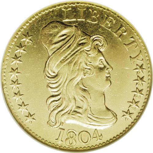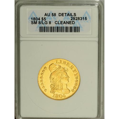 <B>1804 $5 Small 8 Over Large 8--Cleaned--ANACS. AU58 Details.</B></I> Breen-6442, BD-7, R.4. The upper beak tip touches star point, and the upright of the E in STATES is over the cloud space. Well centered design elements show strong definition, including most of the feathers on the eagle's neck and breast. A few inoffensive hairlines are noted on the lightly cleaned, bright canary-gold surfaces that retain considerable luster.<BR><BR><b>Shipping:</b> Coin/Currency (<a target="_blank" href="http://www.heritageauctions.com/common/shipping.php">view shipping information</a>)