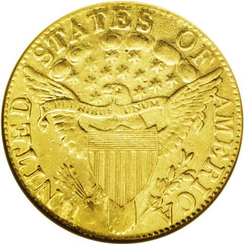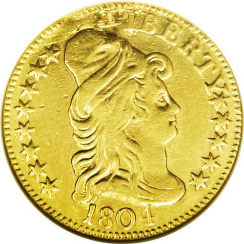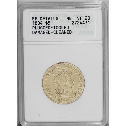 <B>1804<$5> Small 8--Plugged, Tooled, Damaged, Cleaned--ANACS. XF Details, Net VF20.</B></I> Small Date, Breen-6443, BD-3, R.5. Holed and plugged at 12 o'clock on the obverse, which has obliterated the L in LIBERTY. On the reverse, the tips of the arrows were partly re-engraved, as was the U of UNITED, and the right horizontal shield lines have been "assisted" at the right border. These characteristics account for the ANACS description of Plugged and Tooled. There is no doubt the coin has been cleaned, which has left the mustard-gold surfaces unnaturally reflective, but the additional problem that triggered the Damaged description is not readily apparent. A difficult issue, and any example is prized.