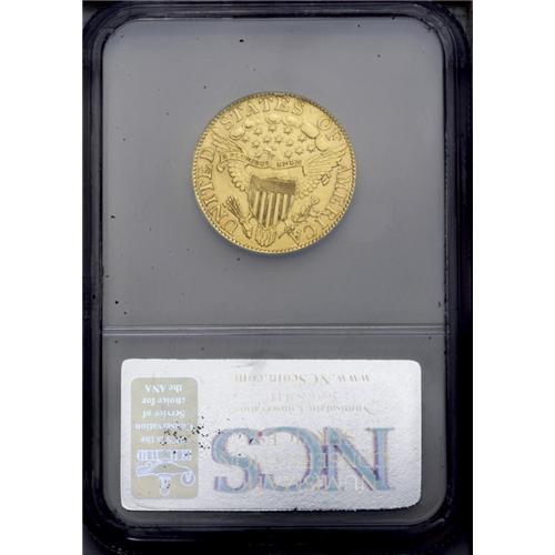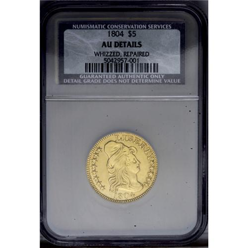 <B>1804<$5> Small 8--Whizzed, Repaired--NCS. AU Details.</B></I> B. 2-E, Miller-64, R.5. The B. 2-E die pairing can be distinguished by the positioning of the upright of the E in STATES slightly left over the break in the clouds. A die crack over the lower portion of the portrait and through the 0 in the date is also diagnostic. Another extends from the eagle's right wing (facing), through the E in AMERICA between 3 and 4 o'clock on the reverse border. An unnatural waviness in the obverse fields suggest that some type of graffiti was smoothed-over in these areas. Repaired or not, 1804 fives are an elusive early gold issue that also carry the desirable cachet of the 1804 date. <BR><BR><B>Important notice:</B> Heritage usually auctions material at the rate of 200-250 lots per hour. On some occasions eBay Live bid software or the Internet may not be able to keep up with the pace of the auction. We recommend placing a realistic absentee bid now as insurance to avoid disappointment. Occasionally the auctioneer may eliminate or reject an eBay Live bid, and the auctioneer may also reopen a lot after the close of the eBay live bidding (usually because we missed an audience bid), and may reject your bid even if it shows you as the winning bidder. By bidding via eBay Live, you agree that Heritage may award the lot to another bidder at its sole discretion under the circumstances described above or any other reasonable circumstances. Since eBay bids are not shown to us until we open the lot on the floor, we treat those bids just like floor bids. In most cases the floor responds before the eBay bid is presented to us, due to Internet lag time, so for consistency we have made it a policy that floor bids are always considered first over tie eBay live bids. Also please note that all Heritage lots purchased through eBay Live carry a 20% Buyer's Premium. Please make sure you read the Terms and Conditions before you bid. This lot is being auctioned in conjunction with a live floor auction by Heritage Galleries & Auctioneers. All final auction and invoice information will be supplied by Heritage Galleries & Auctioneers, and all other information should be considered preliminary. Lot:2618 <BR><BR><B>Winning Notification and Billing:</B> After the FINAL session in this auction is complete, Heritage will send e-mail and snail mail invoices. This process normally takes several days. All final auction and invoice information will be supplied by Heritage Galleries & Auctioneers, and all other information should be considered preliminary. <BR><BR>This auction will be conducted on a live auction floor and over the Internet through eBay Live. If you choose to place an absentee bid, please take a moment to <font color='#0000ff'><u><a href='http://pages.ebay.com/liveauctions/help/before/laabsentee.html'>learn how eBay Live absentee bidding works</a></u></font><font color='#000000'>