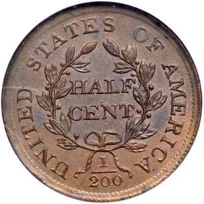 1804 Draped Bust Half Cent. Plain 4, stemless. NGC graded MS-64 BN. C-13. Pop 5; 1 finer in 65BN for the variety at NGC.