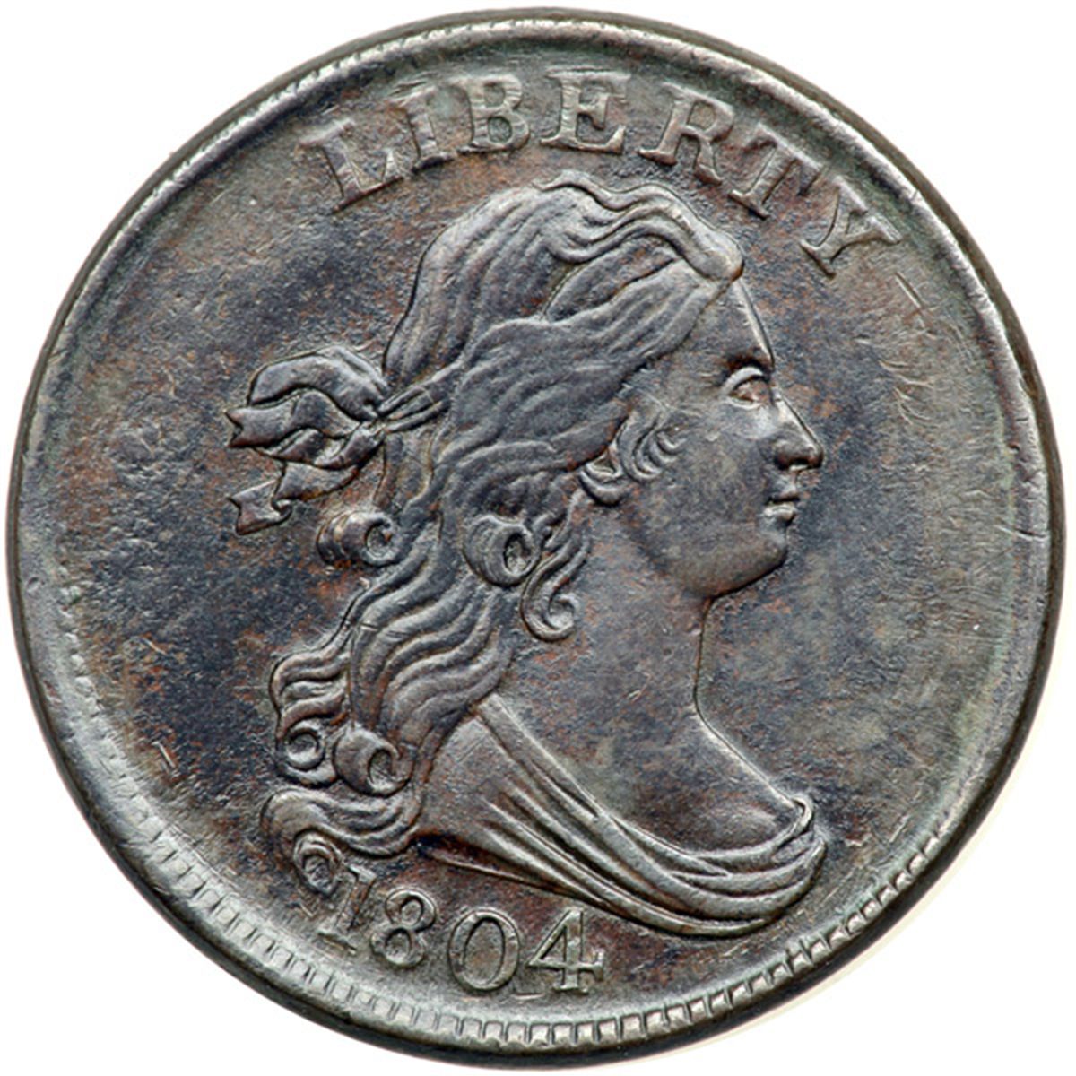 1804 C-10 R1 EF40. Slightly sharper but the toning is a bit dark and uneven. No roughness or marks. Glossy olive brown and chocolate. LDS, Manley state 3.0. The die rust in the obverse fields is obvious and the break through the R in AMERICA is strong.
