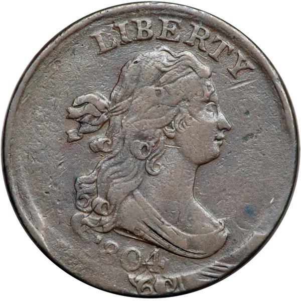 1804 C-10 R1 VF30. Double Struck Off Center. Glossy chocolate brown with slightly lighter steel brown toning in protected areas on the reverse. Frosty flowline luster covers the protected areas. The only mark is a small spot of darker toning off the upper edge of the bust tip. Double struck. The first strike is 30% off center to K-5 and the second is centered but rotated 40 degrees CW. The B and Y of LIBERTY show on Ms Liberty's head and much of the lower curls and bust show under the date and bust. Bold evidence of the first strike shows at the top of the reverse, including ED, AM, and parts of the wreath. It appears the mint had some trouble striking this variety. We can imagine an apprentice learning a new job and fearing for his fingers--or possibly an extra ration of rum for the staff during duty hours. Whatever the cause, we are the beneficiaries. LDS, Manley state 3.0. Davy #04.10.15.