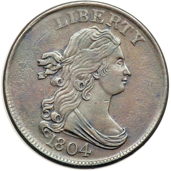 1804 C-10 R1 VF35. Frosty steel brown and chocolate blending to light olive brown on the reverse. Flowline luster covers the fields and protected areas, especially on the reverse. The only mark is a dull, very faint arcing line in the field left of the hair ribbon, and this line is lost in the flowlines and die rust located in that area. Otherwise this piece would rate a slightly higher grade. LDS, Manley state 3.0. The flowlines and die rust in the obverse fields are strong.