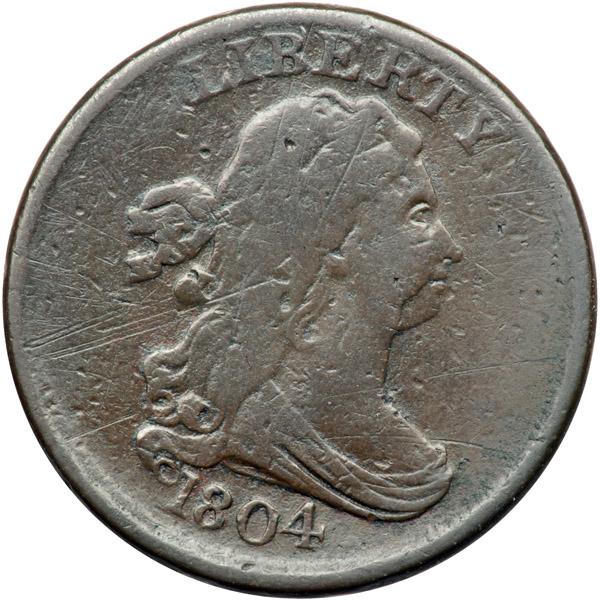 1804 C-10 R1 VG8. Double Struck with Rotation, Reverse Brockage Maker. Slightly sharper but there are some hairline scratches on both sides, strongest in the field under the hair ribbon. These scratches are blended perfectly into the toning and are not especially distracting. Glossy chocolate and olive brown. Double struck. One strike is centered normally on the planchet while the other is slightly off center to the top and rotated 15 degrees CCW relative to the centered one. The doubling is strong on the jaw where a second throat is located but there is no trace of doubling on the reverse. Instead, that side displays some of the swelling that is associated with a piece that became a brockage maker during a second strike. MDS, Manley state 2.0. Davy #04.10.19.