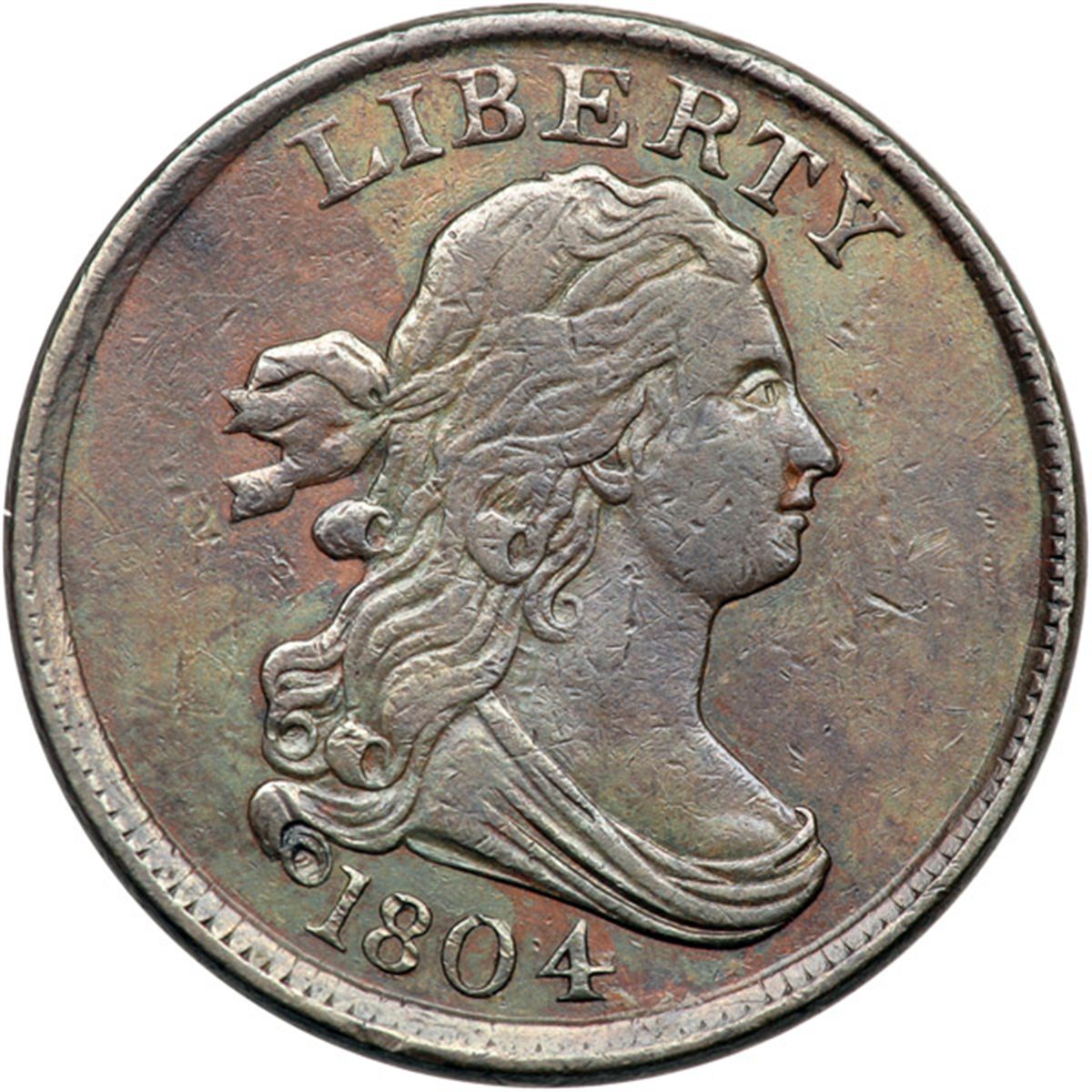 1804 C-11 R2 Plain 4 With Stems VF30. Ten points sharper but lightly cleaned and retoned glossy light olive and chocolate brown with traces of reddish brown toning in a couple of the protected areas. No roughness or verdigris, only a few tiny ticks scattered over both sides. MDS, Manley state 2.0, with subtle swelling in the center of the reverse, but HALF CENT is strong.