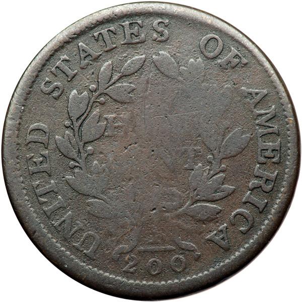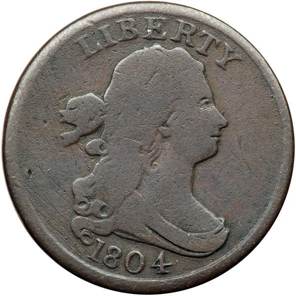 1804 C-11 R2 Plain 4 with Stems G5. Double Struck Obverse. Very slightly sharper with some fine hairline scratches left of the lowest curls, all blended perfectly into the natural toning. No roughness or verdigris. The date and legends are complete and clear except for weakness inside the wreath due to die swelling in that area. Double struck, but the doubling only shows on the obverse. The doubling is very fine but clearly visible on the date and profile of Ms Liberty with weaker doubling elsewhere. There is no trace of doubling on the reverse, but the low grade may have eliminated that evidence. M-LDS, Manley state 2.0 late with strong swelling in the center of the reverse that nearly obliterates HALF CENT and parts of the wreath. Davy #04.11.13.