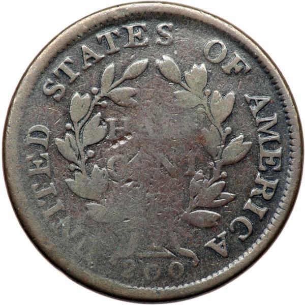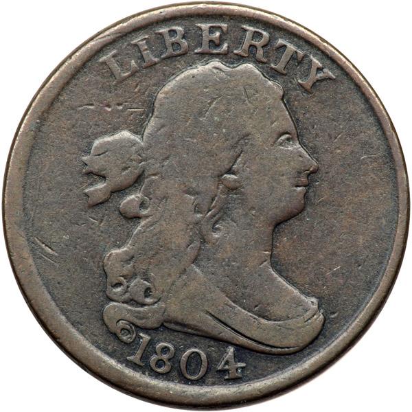 1804 C-11 R2 Plain 4 with Stems VG7. Glossy steel brown and chocolate fading to olive brown in protected areas. Smooth and attractive for the grade, just worn. A trio of tiny marks at the H in HALF can help identify this piece. LDS, Manley state 3.0. The swelling on the reverse is now quite strong causing most of the lower part of the wreath to be missing and most of HALF CENT faint or gone as well. Certainly wear had something to do with the weakness, but die swelling was a major factor. The reverse die must have been discarded shortly after this strike, thereby liberating this obverse for its subsequent mating with the Stemless C-13 reverse. Davy #04.11.18.