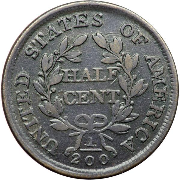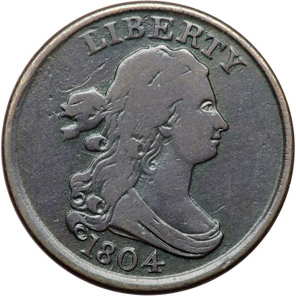 1804 C-11 R2 Plain 4 with Stems VG8. Glossy dark steel and olive with slightly lighter steel brown toning on the devices. Virtually flawless except for a tiny contact mark in the field over the hair ribbon and a dull mark on the rim at the bust tip. MDS, Manley state 2.0, with a subtle bulge in the center of the reverse causing weakness on the ribbon loops and bottom of the wreath. HALF CENT remains complete and clear. Davy #04.11.15.