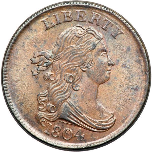 1804 C-12 R2 Crosslet 4 without Stems MS63. Lustrous light steel brown and tan delicately speckled with darker steel toning, mostly on the obverse. Traces of faded mint red remain visible in some of the protected areas on both sides. The only marks are a collection of tiny, very light nicks at the top of the second A in AMERICA. Excellent eye appeal. MDS. Removed from an NGC slab graded MS64 Brown (NGC label included).