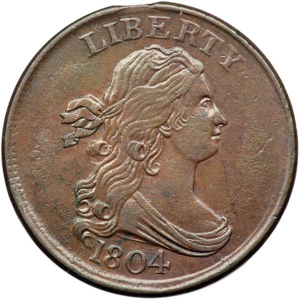 1804 C-12 R2 Crosslet 4 without Stems VF35. Clipped Planchet. Sharpness EF45 but lightly cleaned and nicely retoned glossy chocolate and steel brown. The only marks are some very tiny spots of dark greenish olive toning scattered over the reverse and faint hairlines near the rim left of the hair ribbon. M-LDS with die rust and radial flowlines in the obverse fields. A small, curved planchet clip affects the dentils above IBE and the opposing ones under the 2 in the fraction. Davy #04.12.10.