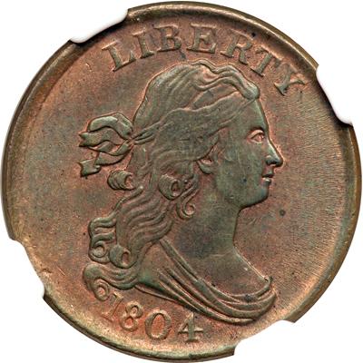 1804 C-13 R1. NGC graded MS-64 Red & Brown. Plain 4 without Stems. Lustrous mint red fading to bluish steel and light olive brown, at least 25% of the mint color remaining on both sides. The only marks are a tiny diagonal swipe of dark planchet impurity under the B in LIBERTY and a speck of dark toning in the field off the end of the chin. Otherwise this piece is a gem. MDS, Manley state 2.0. A superior example of the Plain 4 without Stems variety. Our grade is consistent with the slab grade. Pop 8; 3 finer in 65RB.